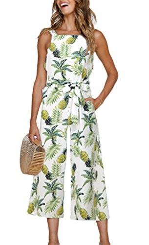 Dongpai Women's Floral Print Strap Jumpsuit Sleeveless Tie Waist Wide Leg Pant Rompers with Pockets